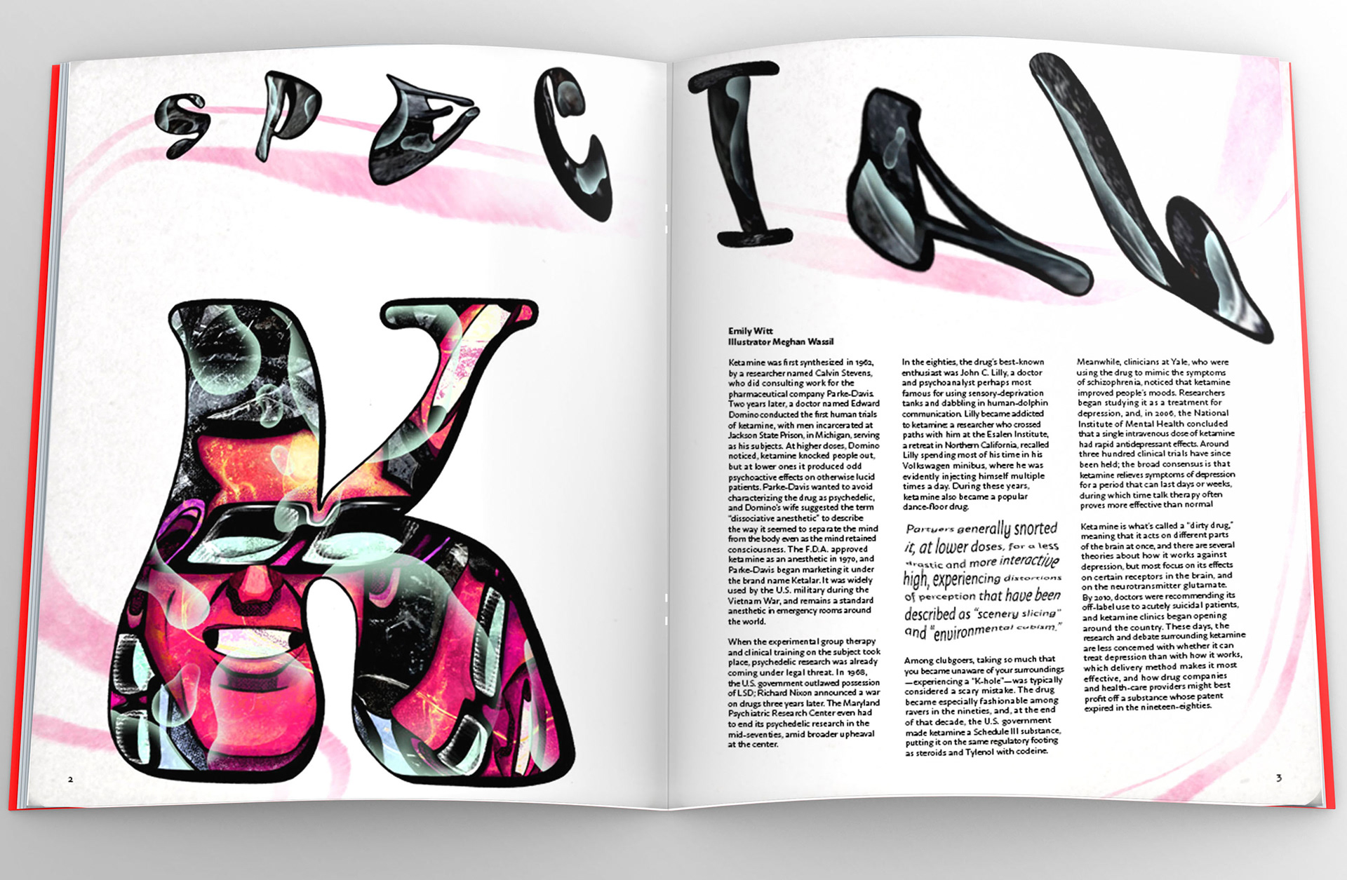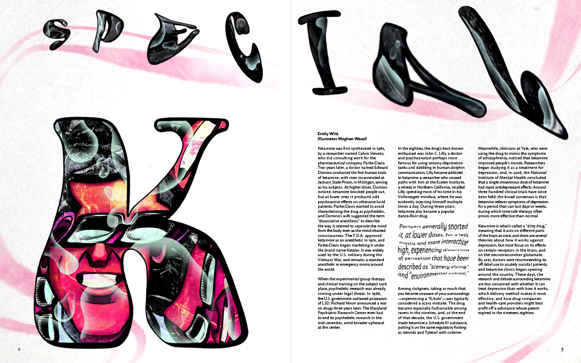 Spec illustration spread design. Article discussing the benefit and downside to treating anxiety and depression with ketamine.
